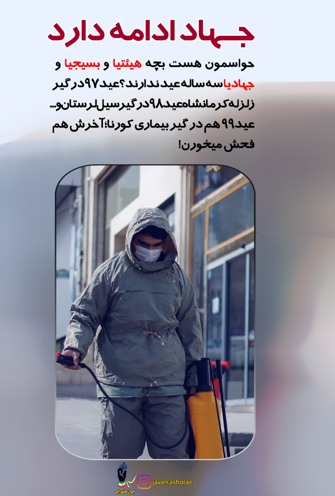 حواسمون هست بچه هیئتیا و بسیجیا و جهادیا سه ساله عید ندارند؟عید97درگیر زلزله کرمانشاه عید98 درگیر سیل لرستان و... عید99 هم در گیر بیماری کورنا؛آخرش هم فحش میخورن! برچسبها: جهاد, بسیجی ها, هیئتی, جوان عاشورایی