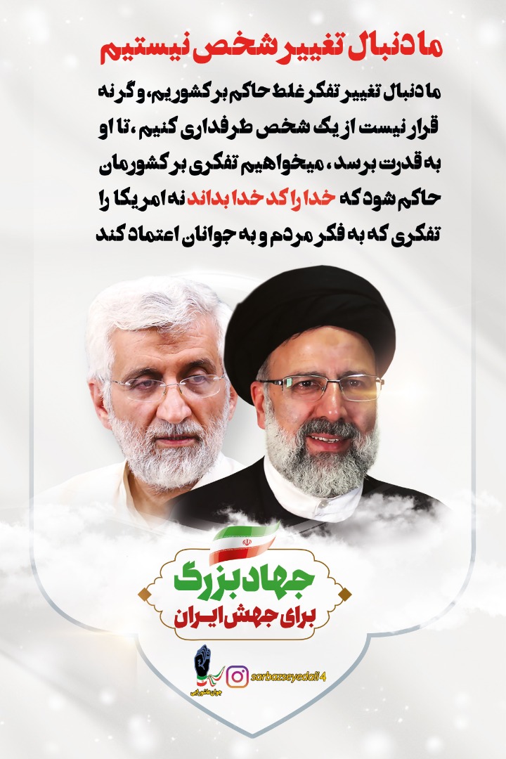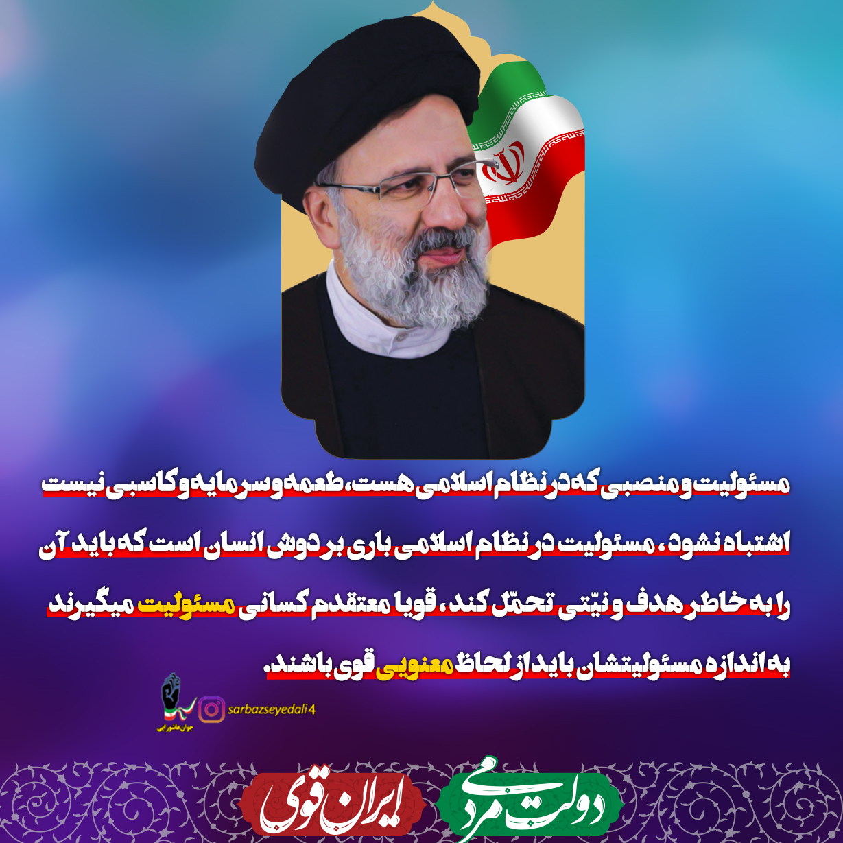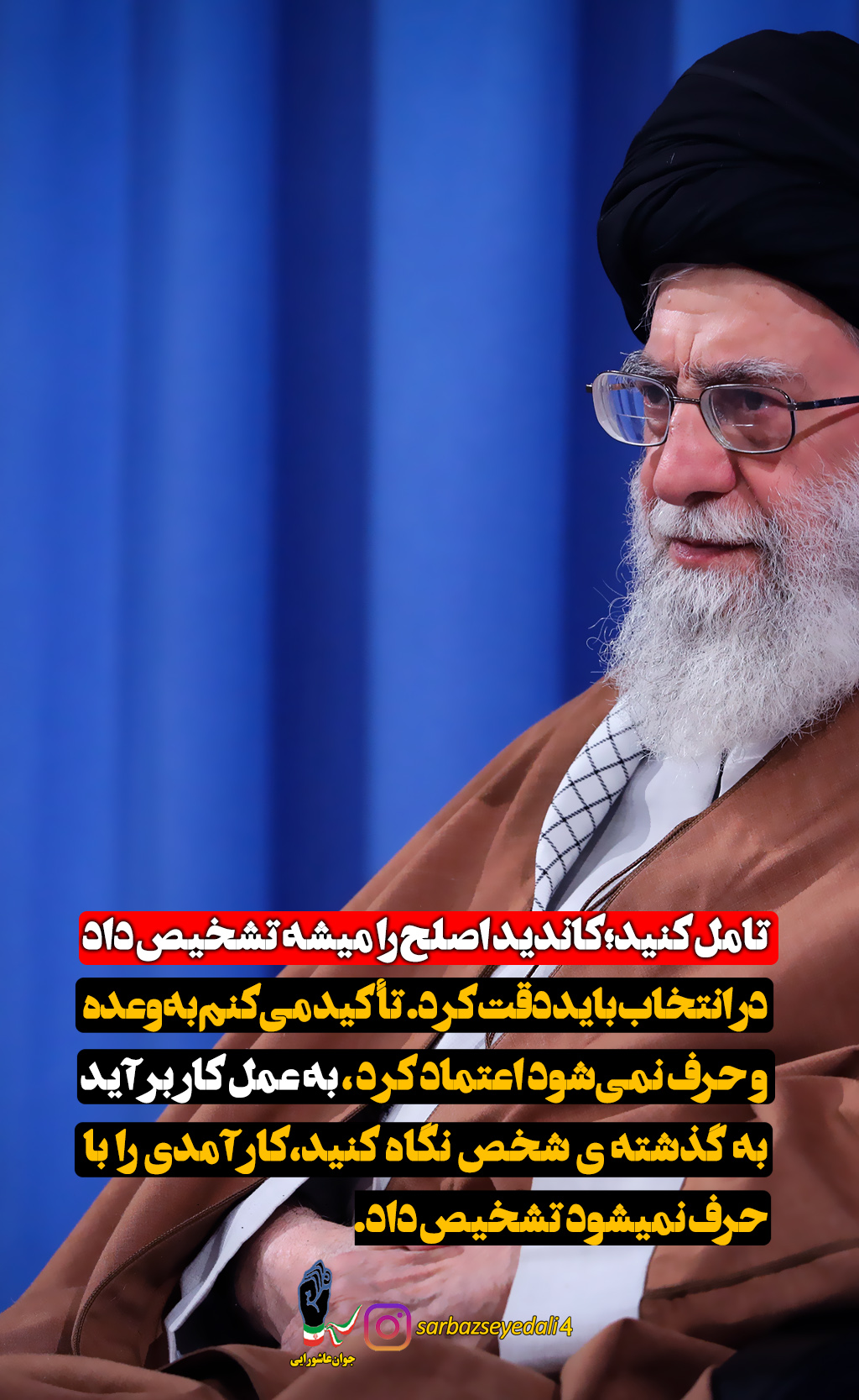 نگاه اسلام به زمامداران و مسئولان جامعه، بسیار سختگیرانه است، چنان نیست که قبول مسئولیت امتیازی ویژه باشد" و مردم از هر سو برای رسیدن به آن بشتابند. مسئولیت در اسلام، امانتی الهی است. امیرالمؤمنین (علیهالسّلام) در نامهی ۵ نهجالبلاغه خطاب به اشعثبن قیس -از کارگزاران حضرت در منطقه آذربایجان- اینگونه میفرماید: «وَ إِنَّ عَمَلَکَ لَیْسَ لَکَ بِطُعْمَةٍ وَ لَکِنَّهُ فِی عُنُقِکَ أَمَانَة»، یعنی حکمرانی برای تو طعمه نیست بلکه امانتی بر عهدهات است،میتوان از دریچه نگاه کنیم برای انتخاب اصلح "چهل سال در حساس ترین پست های قوه قضائیه باشی "با گردن کلفتان و زالوصفتان رانت خوار مقابله کنی و محاکمشان بکنی نتوانند یک لکه خاکستری از تو و خانوادت پیدا کنند"یعنی پاکدستی "یعنی میتوان به تو اعتماد کرد . . . معبرجوان عاشورایی برچسبها: انتخابات, رئیسی, جلیلی, جوان عاشورایی