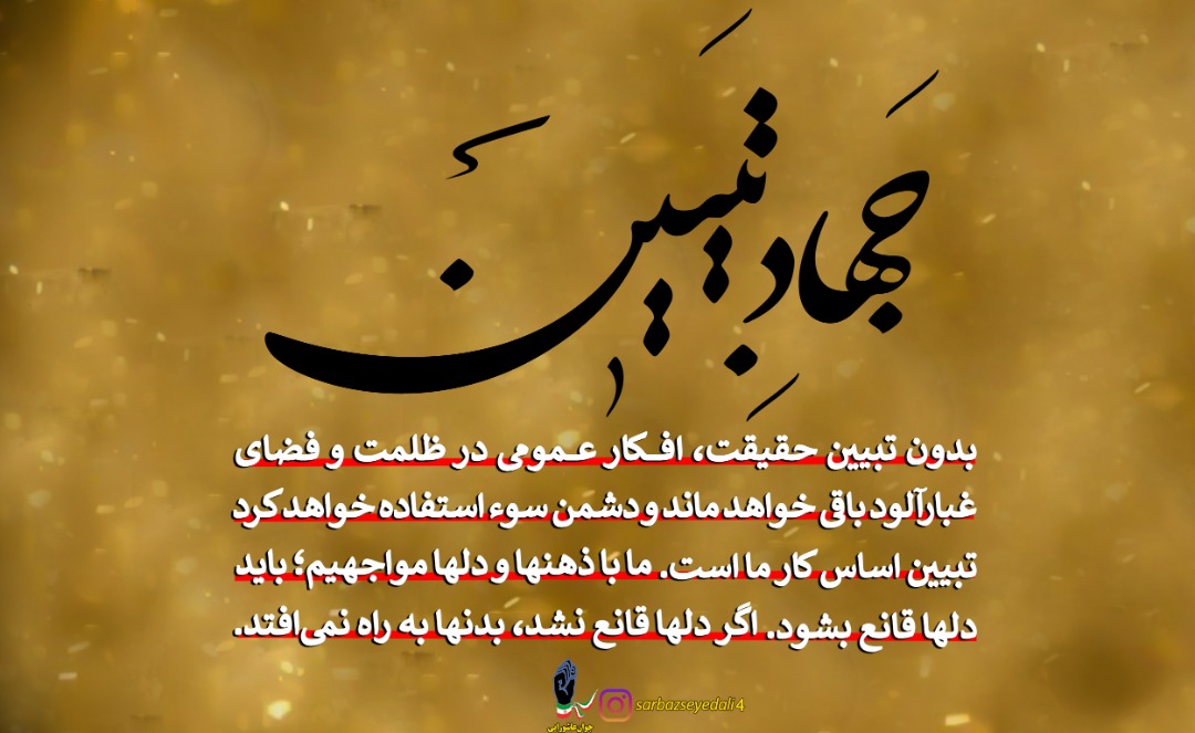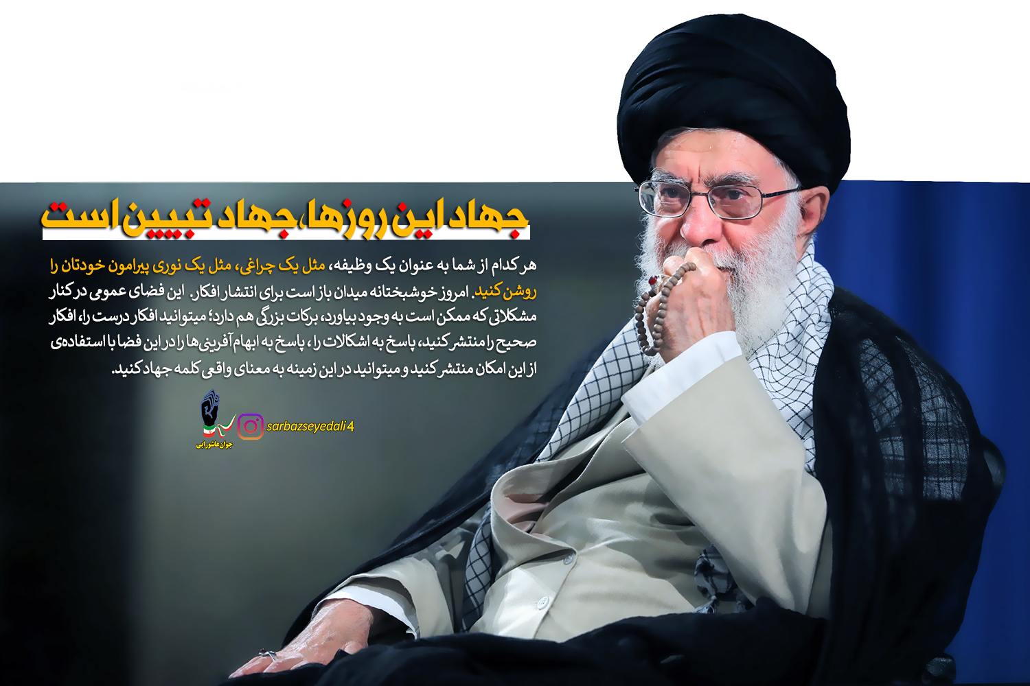 جهاد این روزهای ما جهاد تبیین است خیلی از حقایق هست که باید تبیین بشود. در قبال این حرکت گمراهکنندهای که از صد طرف به سمت ملّت ایران سرازیر است و تأثیرگذاری بر افکار عمومی که یکی از هدفهای بزرگ دشمنان ایران و اسلام و انقلاب اسلامی است و دچار ابهام نگه داشتنِ افکار و رها کردن اذهان مردم و بخصوص جوانها، حرکت تبیین خنثیکنندهی این توطئهی دشمن و این حرکت دشمن است. پروردگارا، ما را سربازان جهادِ عظیمِ این روزگار که جــهـاد تبیین است قرار بده. معبرجوان عاشورایی برچسبها: جهادتبیین, جوان عاشورایی, جوان انقلابی