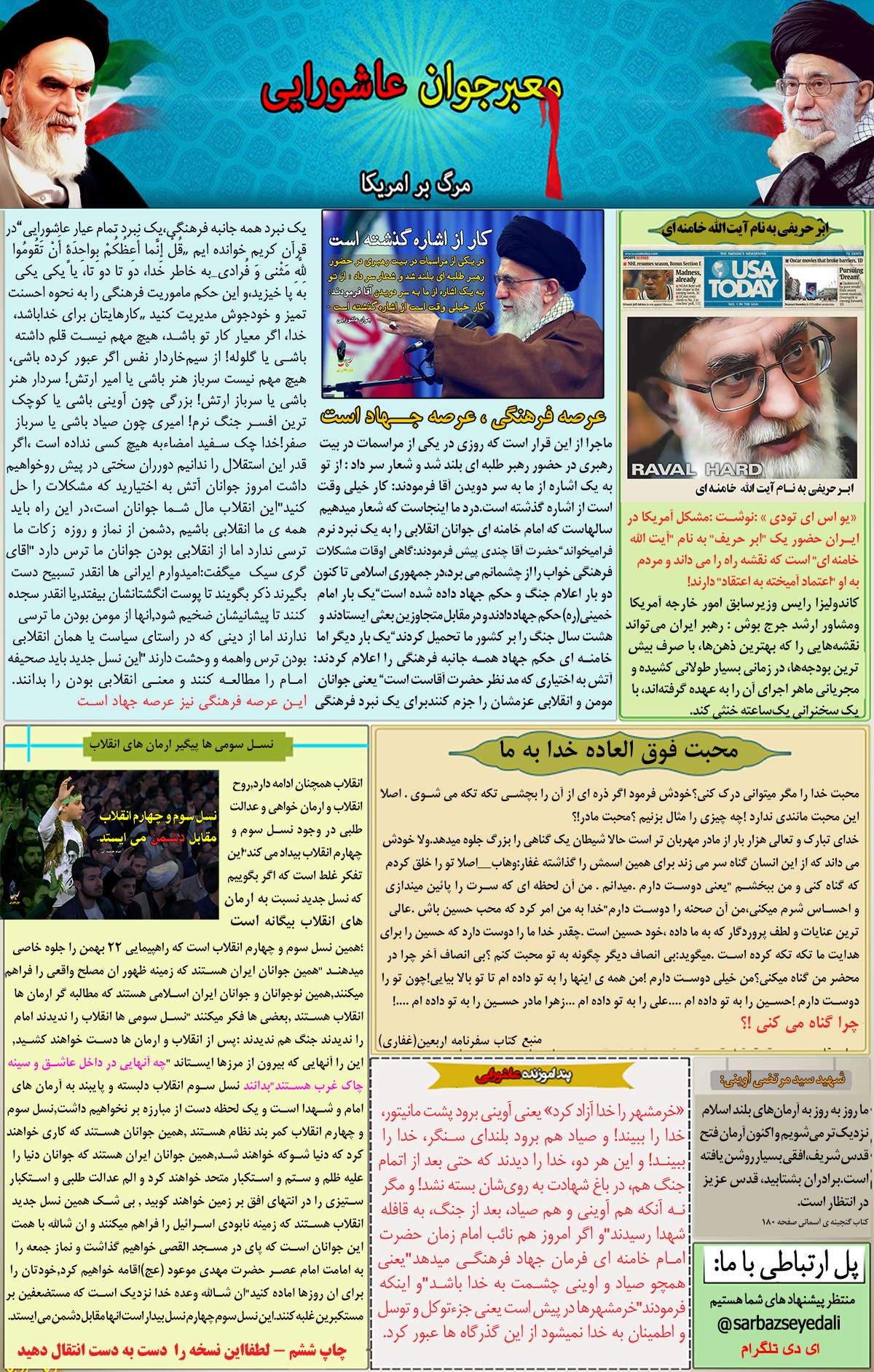 جوان عاشورایی وقتی که میبیند در این جنگ بر اصل نظام وفرهنگ لطمه میخورد پا در میانی میکند ولباس رزم می پوشد اماده جهاد می شوذد امروز جوان عاشورایی به مصاف دشمنی رفته است که همه امکانتی را در اختیار دارد اما جوان عاشورایی با قدرت ایمان به خدا این جنگ را به خوبی اداره می کند و پیروز میدان است ان شالله همیشه عاشورایی باشید